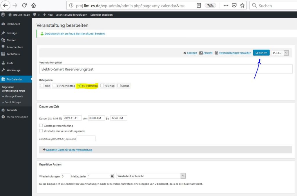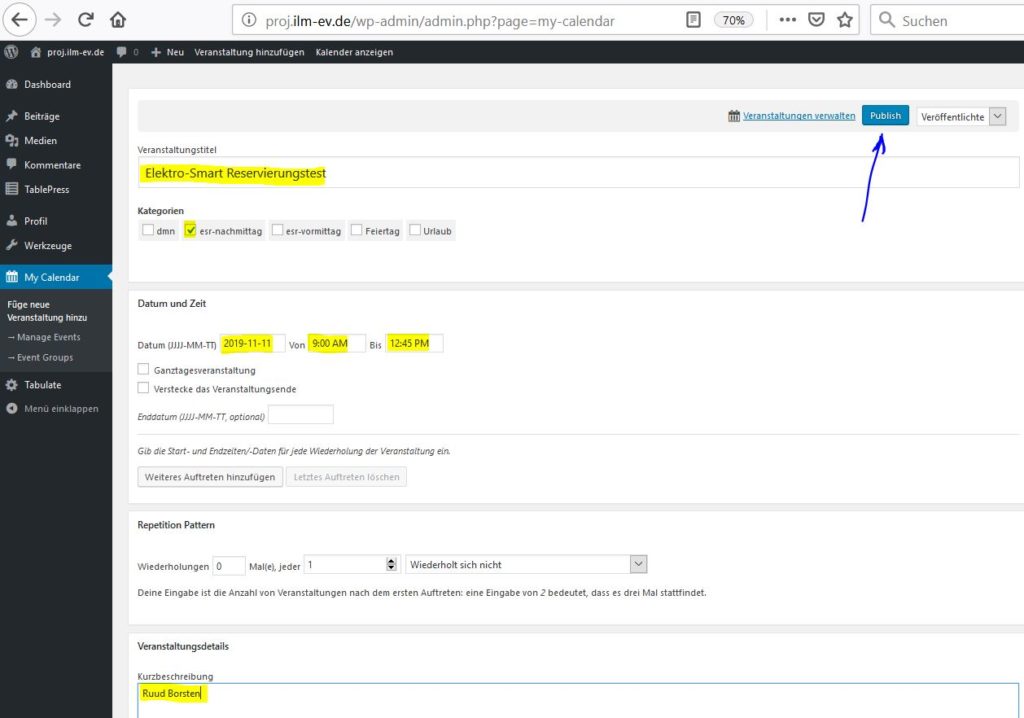 Einen (passenden) Text unter Veranstaltungstitel eingeben. Unter Datum und Zeit das Datum im Format JJJJ-MM-TT und Uhrzeit eingeben (AM = Vormittag, PM = Nachmittag). Bitte nicht vergessen eine passenden Kategorie aus zu wählen! Im Beispiel unten ist mit Absicht den falschen (Nachmittg passt nicht zu den gewählten Zeit) ausgewählt! (In Schritt 7 wird gezeigt, wie dies korrigiert wird.) Unter Kurzbeschreibung (ganz unten) können Sie einen Kundennamen eintragen. Dann auf Knopf Publish drücken.