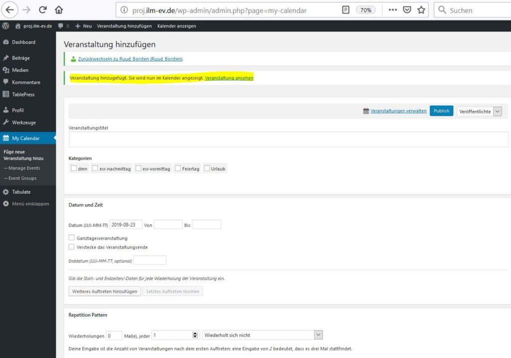 Nun erscheint der Veranstaltung in der richtigen Farbe und kann durch den Knöpfen unter Kategorien gefiltert werden.