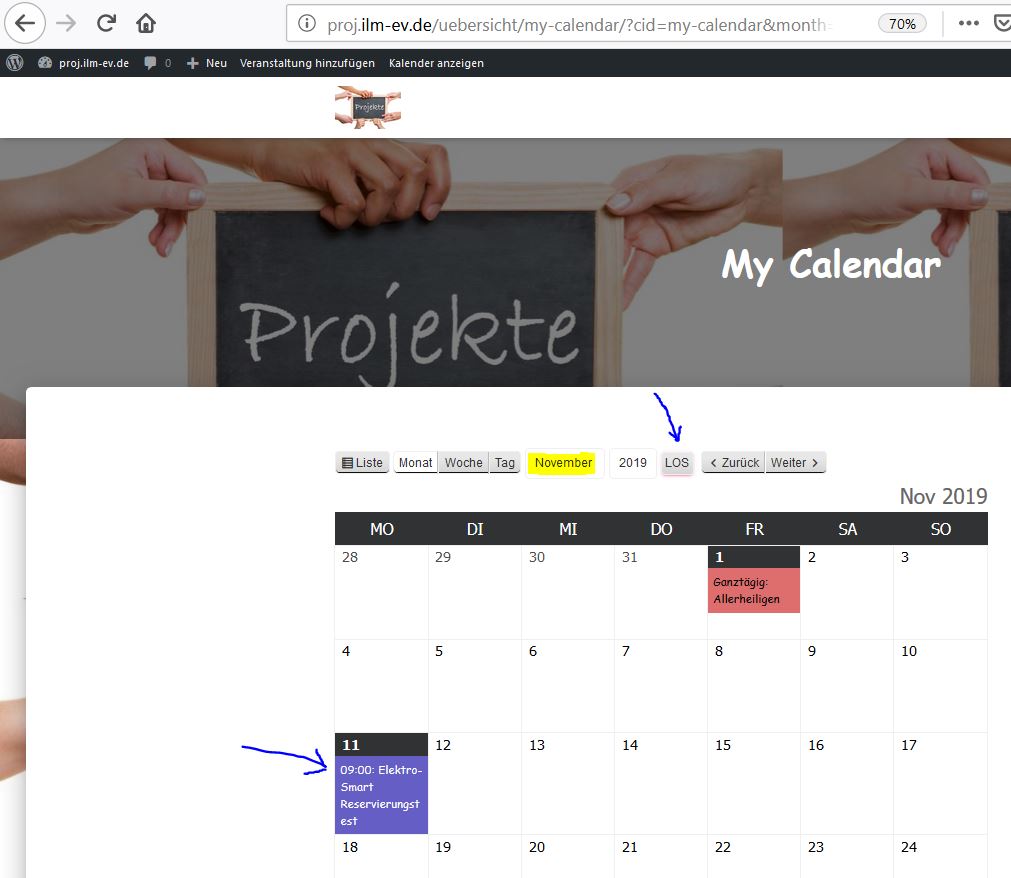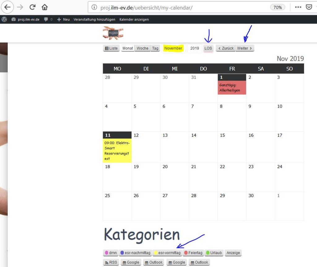 Den richtigen Monat eingeben und auf Los drücken oder mittels den Knopf weiter dort hin blättern. Es erscheint der Veranstaltung in der zum ausgewählten Kategorie passenden Farbe.
